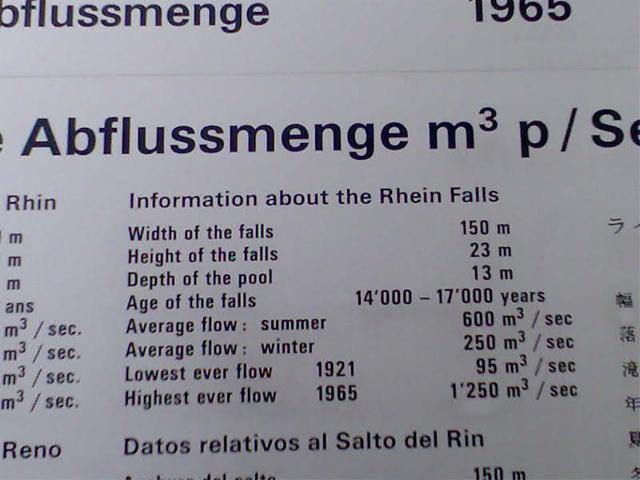 Tania Libkind добавил(а) [date]1191791609[/date]: Ширина водопада 150 м Высота 23 м Глубина 13 м Возраст 14000 - 170000 лет (!!!!!!) Средний поток: летом 600 м3/сек Средний поток: зимой 250 м3/сек Наименьший когда-либо поток 1921 95 м3/сек Наибольший поток 1965 1250 м3/сек _______________________________________