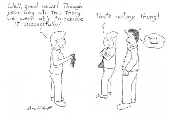 Вет: - Новости хорошие! Ваши thong, кот. сожрала Ваша собака, мы благополучно извлекли! Владелица - владельцу: - Ето не мои thong