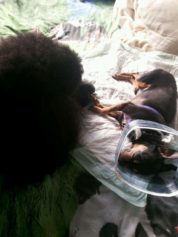 А Бароша этим летом присматривал за своим названным братцем той терьером,оказал мне в этом большую помощь ,малыш перенес операцию по удалению травматической катаракты на правый глаз и еще одна операция предстоит на левом глазу.Барон очень бережно к малышу относился и не отходил от него,иногда сообщал мне ,что надо подойти .Вот фото ,где Бароша жалеет малыша.