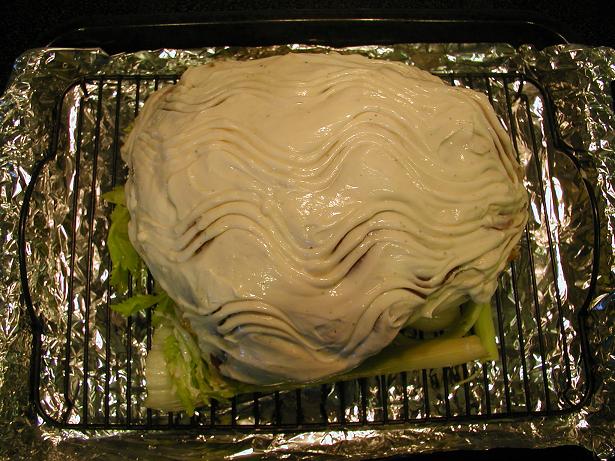 Весьма вкусное блюдо. Мясо получается очень сочным. Берется часть мяса от ляжки или плеча одним куском. Ножом делаем надколы и вставляем туда кусочек свежено чеснока. Натираем мясо смесью чеснока, черного перца, гвоздики, можно добавить приправы для стейков (вырезки говядины) и лимионом.Даем постоять в холодильнике денек. Зетем выстилаем решетку любой зеленью, чтобы мясо снизу не подгорало и оставалось сочным. Сверху обмазываем майонезом ( один сантиметр) и в духовочку на 400( по фаренгейту). Как только поджарится верх - снизить температуру до 375( по фаренгейту), накрыть фольгой матовой стороной вверх, воткнуть термометр и терпеливо дожидаться пока температура поднимется до 160 -170 (по фаренгейту). Мясо вытащить из духовки и оставить остывать минут на 40. Подавать нарезанным с любой зеленью или картофелем с розмарином.......... |