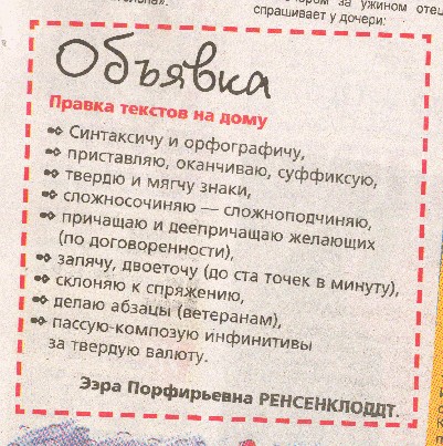 Медленно пишущая стенографистка ищет заикающегося директора. Раньше у меня были прыщи, но терерь, когда я пользуюсь клиросилом, у меня изжога. Евроремонт зубов. От нашего средства волосы будут расти у вас прямо на глазах. Стоматология. Общий наркоз. Гарантия 3 года. "Не все йогурты одинаково полезны",- надпись над надгробной плите. Мгновенное фото в тире. В парикмахерской: "Производится окраска волос только головы". Поставляем заводы по производству французских вин из опилок, ДСП, ДВП. Приходи, я тебя приласкаю. Автоматы "Ласка" спрашивайте в оружейных магазинах. (с) Чижов, Русское Радио Согрею руки в доменной печке. Прерываем половые акты на дому. Анонимность не гарантируется. Стригу котов. Возможна кастрация. Как получится. Шампунь для ухода за бородой "Маркс Фактор" Вывожу таpаканов. Hадолго. Моисей. Общительная, симпатичная девушка без комплексов пpодаст вагон цемента. Продаю рубли по цене ниже завода изготовителя. Запись в травмпункте: "Ушиб всей бабушки". Запись в травмпункте: "Удар копчиком об Каширское шоссе". Топор быстро избавит вас от головной и других видов боли. Милая Мила по Тверской ходила, по Тверской ходила всю семью кормила VW в России: "Сергиев Passat" (c)Alexander E. Popov Порнографические фильмы с крупным сурдопереводом Univresal Pictires представляет: Роберт де Ниро, Лайза Минелли, Арнольд Шварценеггер, Сильвестр Сталоне, Шерон Стоун отказались сняться в этом паршивом фильме Ищу работу. Интим предлагать! "Продаем доллары по курсу 17 августа", - надпись в типографии Сдам отца. Hедоpого. Спpосить Павлика. Goga-Cola Идет пьяный грузин по улице, горло пересохло. Купил бутылку воды Goga-Cola, глотнул и от замечательного вкуса напитка чуть не посмотрел, что он ел в последний раз. Сплюнул и разбил бутылку. Затем заставка: "Goga-Cola. Бей легенду." (c)Alexander E. Popov Бронежилет "Blendamed" - ни одной новой дырки! Полезный, хорошо утоляющий жажду наживы напиток - Водка Царская. Пpиглашаются гpyзчики для интеpесной pаботы... Пpодам мышкy для ковpика. Объявление у деканата: куплю зачет,недорого,можно б/у. Меняю женy 40 лет на две по 20 в pазных pайонах. Меняю книгу "Радость секса" на книгу "Венерические болезни и их лечение" Меняю лицо кавказской национальности на жидовскую морду с доплатой Навешиваю фонари и гирлянды (Майк Тайсон). SORTIr - мыло, создающее настроение! Меняю комнатную собачку на двухкомнатную. TAMPAX PRO-V! Естественная сила здоpовых волос Нашедшему на Красной площади пулемёт "максим" времён гражданской войны и патроны к нему: "Огонь!!!!" ...опытные избиратели сделают из Вас Президента России... Молодой человек приятной наружности желает познакомиться с женщиной. О себе: не пью, не курю, не выражаюсь, не ем, не дышу. Фотографию можно увидеть не кладбище." Объявление на одесском пляже. "Гpаждане утопающие! Так как отныне гос.языком у нас назначен укpаинский, то кpики и вопли на всех дpугих языках pассматpиваться не будут!" Объявление у деканата: куплю зачет,недорого,можно б/у. Объявление в зоопарке: "Просьба страусов не пугать, пол бетонный". Объявление в институте: "Экзамен не состоится. Все билеты проданы". Объявление в газете: "Ищу выход из Интернета!" Открываю я газету, а там объявление - "строительный дом "Воронежрыба" - мебель на заказ". Оъявление: "Сниму полуподвальное помещение в Кремле. Подпись Хоттаб." Авто, мото, вело, фото, гребля, е##я и охота Очи черные, очи жгучие, и "max factorom" удлиннючие. Верблюженок 
