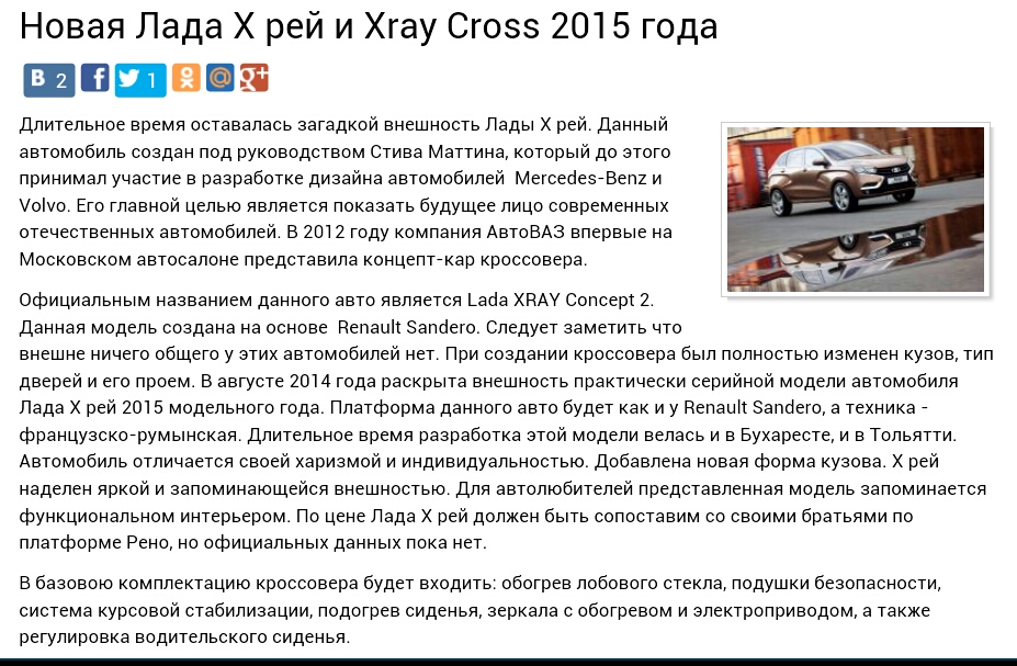 Совсем немного осталось до старта продаж новой Lada X-Ray и Lada Vesta. На эскизах машины выглядят, как конфетки, и стоимость, которую я видел на различных форумах и сайтах, выглядела тоже привлекательной. Все пока что настолько красиво, что я начал уже подумывать, а не купить ли себе новую русскую тачку?))) До того, как я увидел концепты этих машин, к российскому автопрому я относился, мягко говоря, скептически, но увидев этих малышек, мне сразу захотелось кого-нибудь из них заиметь=) Как думаете, российским автопром уже достаточно эволюционировал, чтобы можно было ставить наши машины в один ряд, с Фордом, например, или любым другим середняком авторынка? Или же нам до этого ещё далеко? А то точки с виду, вроде бы, очень красивые и по характеристикам ничего, но пока они в производство и, соответственно, в продажу не поступят, говорить и прогнозировать что-то боюсь ) |