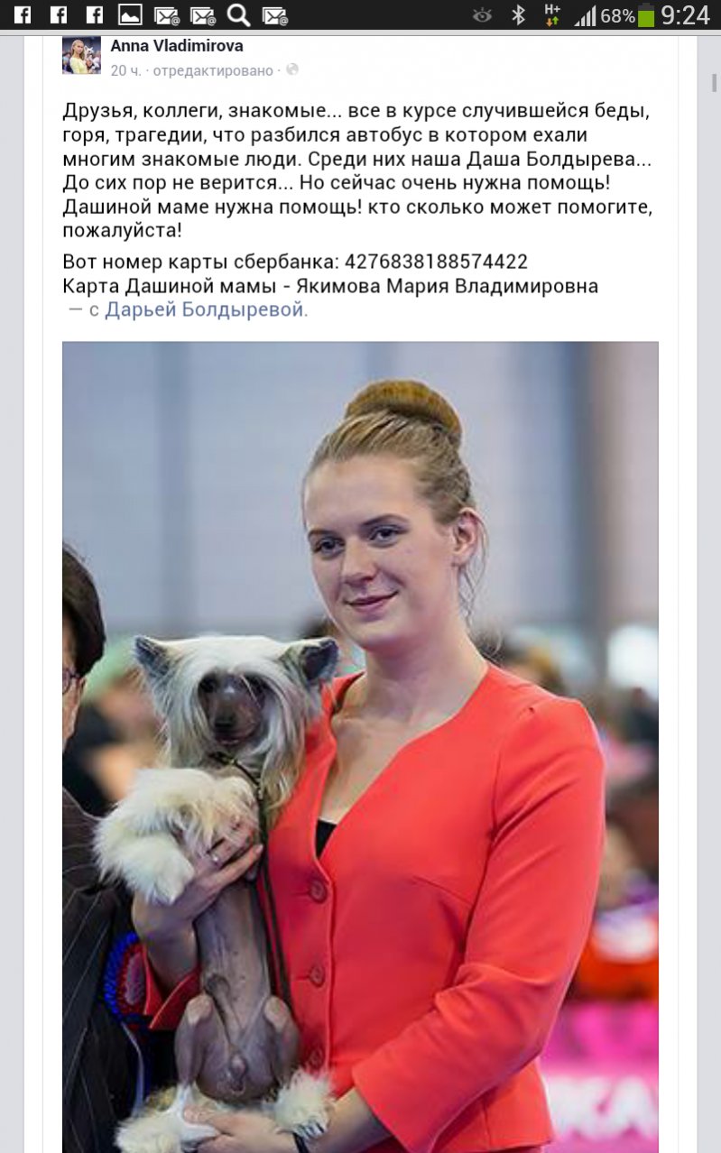 От РКФ В понедельник утром шесть человек погибли в ДТП в Смоленской области Страшная авария произошла в понедельник утром на Минском шоссе неподалеку от города Гагарина в Смоленской области. В 5 утра столкнулись лоб в лоб микроавтобус мерседес и автомобиль КамАЗ. В микроавтобусе ехали собаководы: Скоропупова Татьяна (1974 г.р, питомник Shen de Lux, г. Владивосток), Батурина Мария (1975 г.р., питомник пшеничных терьеров <<Мариоль>>, г. Владивосток), Болдырева Дарья (1992 г.р., хендлер, питомник китайских хохлатых <<Маленькие ангелы>>, г. Москва), Хохлова Юлия (1963 г.р., питомник скотч-терьеров <<Райское наслаждение>>, г. Хабаровск). Заводчики везли на выставку World Dog Show-2015 в Милан 19 собак: трех хаски, одного пшеничного терьера, двух скотч-терьеров, шестерых цвергпинчеров, двух пинчеров, двух басенджи, одну мексиканскую голую собаку, пекинеса и русского тоя. Все люди и собаки погибли, включая водителей обоих транспортных средств. Погибшие заводчики всю свою жизнь посвятили популяризации пород в регионах, развитию отечественной кинологии. Их собаки - многократные победители крупных международных выставок, обладатели огромного количества чемпионских титулов. Новость о трагедии долетела до Италии. Погибших российских заводчиков почтили минутой молчания на проходящем в эти минуты заседании Генеральной Ассамблеи FCI. Светлая память... РКФ выражает соболезнования родным и близким ... ¶ _______________________________________